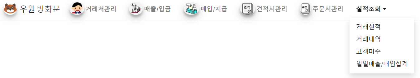 기간(yyyy-mm-dd ~ yyyy-mm-dd)과 매출/매입 구분, 거래처(선택)를 지정하여 거래 내역(상품,작업)을 조회 할 수 있다.
